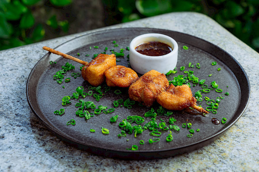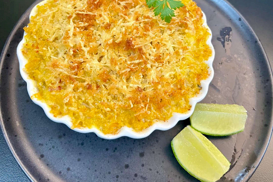 Filé de Pintado ao Molho de Creme de Leite de Coco com Crispy de Mandioca.