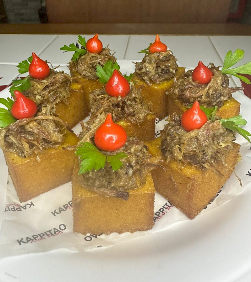 Bolinho de pernil defumado com cebola caramelizada